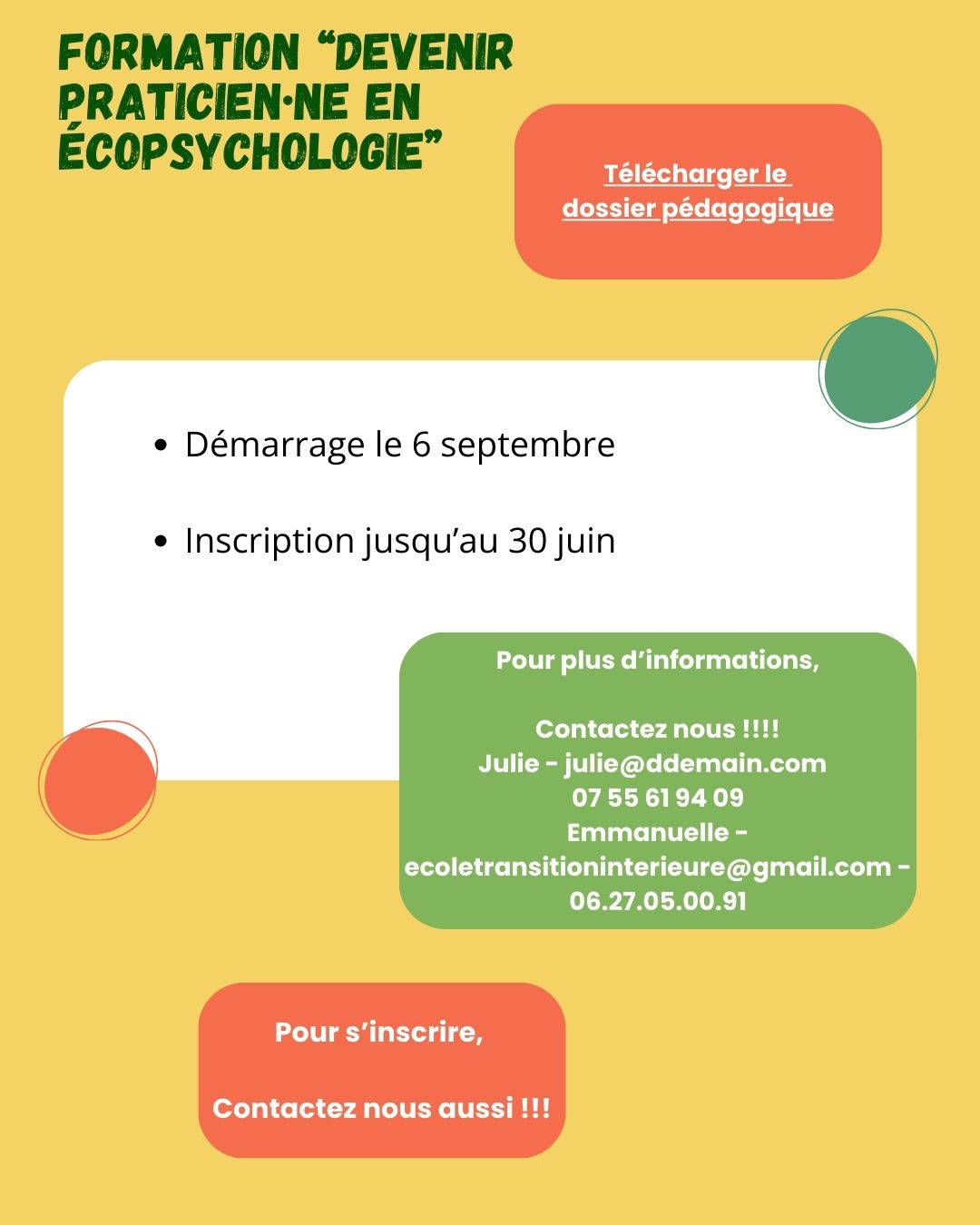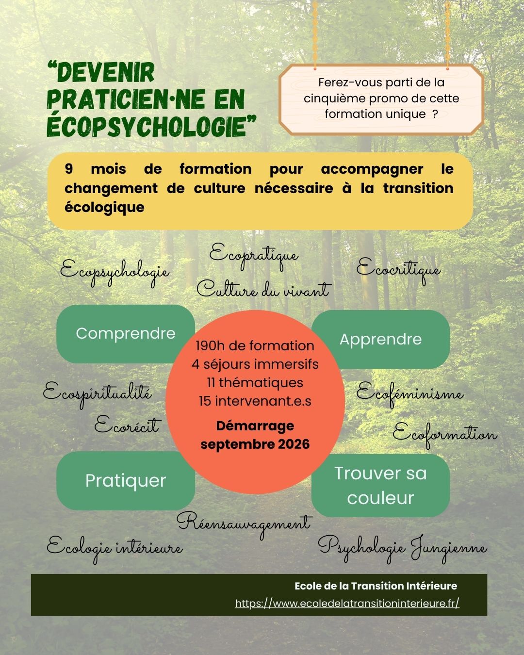 SessionLa formation «Devenir praticien·ne en écopsychologie» revient en 2026-2027 pour sa cinquième édition. Entre stages saisonniers en présentiel dans des lieux inspirants, visioconférences avec une quinzaine d’intervenant·es, supervisions et codéveloppement de projet, un parcours pour expérimenter avec d’autres l'écopsychologie et se relier plus profondément au Vivant. Un corpus de 11 modules, dont l’un sur l’écospiritualité, visant à acquérir des compétences pour comprendre et mettre en œuvre les nécessaires changements de paradigmes sociétaux et individuels, acquérir une posture plus engagée, subversive et compatissante au service de la Terre, faciliter des écopratiques en lien notamment avec la traversée des troubles de santé mentale générés par les dégradations écologiques.