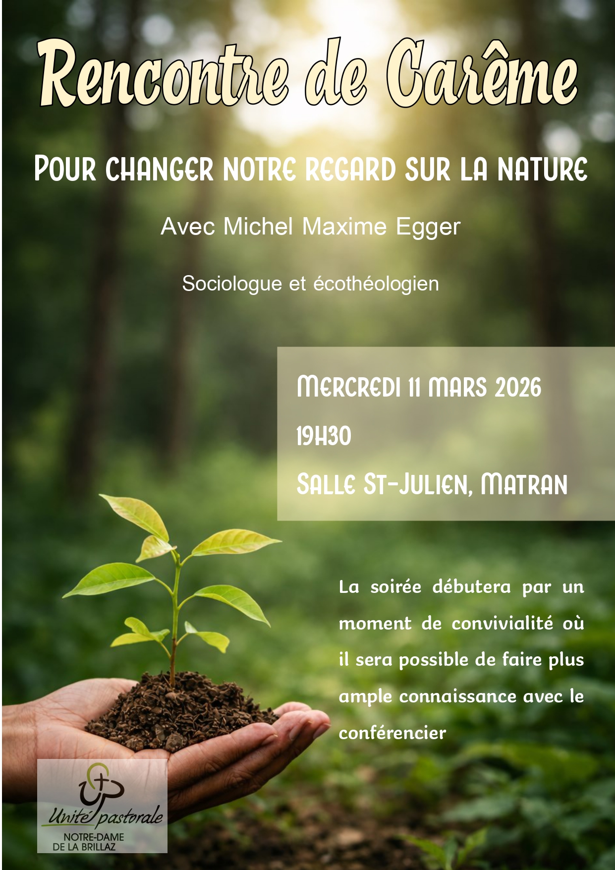 Dans le cadre des rencontres de Carême de l'Unité pastorale Notre-Dame de la Brillaz, une soirée de conférence et d’échanges pour éclairer les bouleversements écologiques par les Ecritures et l’écospiritualité. Un chemin de métanoïa qui consiste notamment à se mettre à l’écoute de la Création pour réenchanter notre regard sur la nature, retrouver la juste place de l’être humain dans le vivant et transformer notre «jardin» intérieur.
