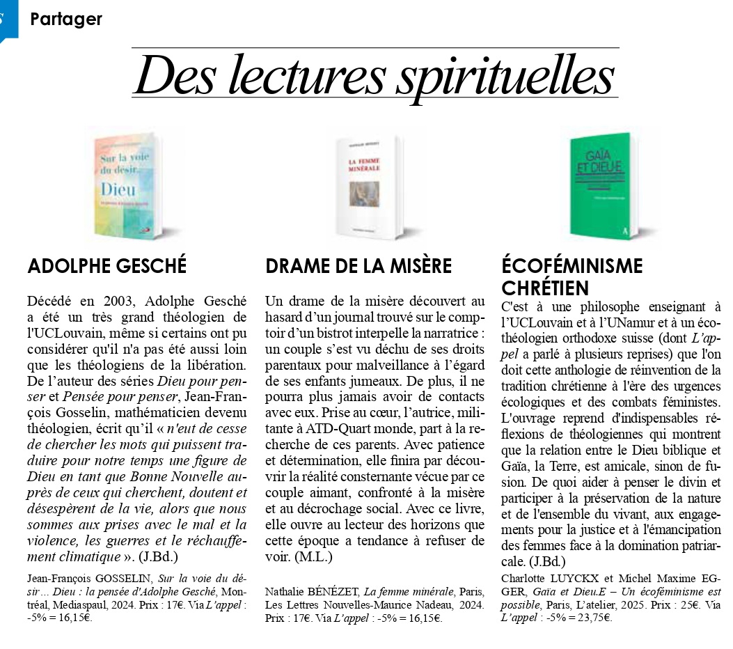 Gaïa, la Terre, est amicale, sinon de fusion. De quoi aider à penser le divin et participer à la préservation de la nature et de l’ensemble du vivant, aux engagements pour la justice et à l’émancipation des femmes face à la domination patriarcale.L’Appel, n°480, septembre 2025.